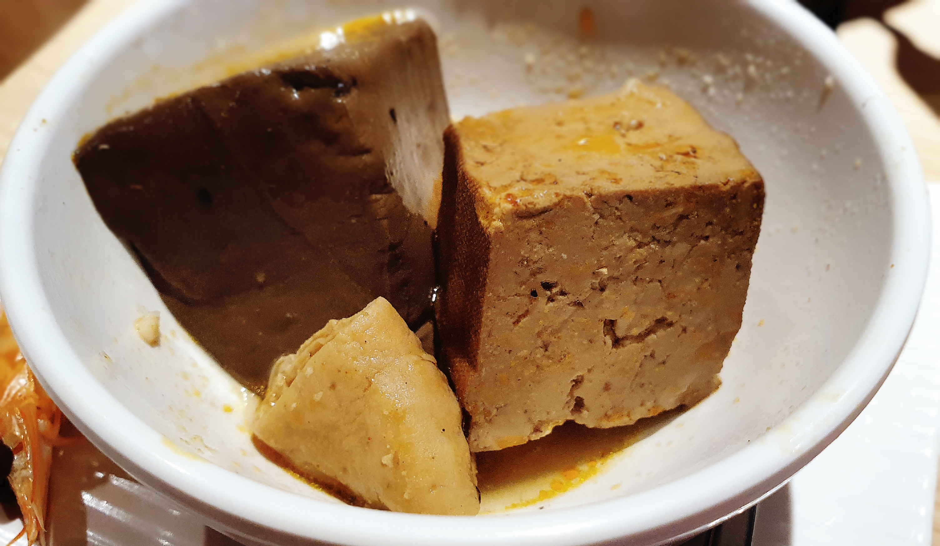 一般店家多半只有鴨血和豆腐,饗麻饗辣多了一鍋麻辣大腸頭。吃麻辣鍋少不了這三樣,這兩鍋已經把食材滷得很入味,放鍋裡熱一下就可以吃了。