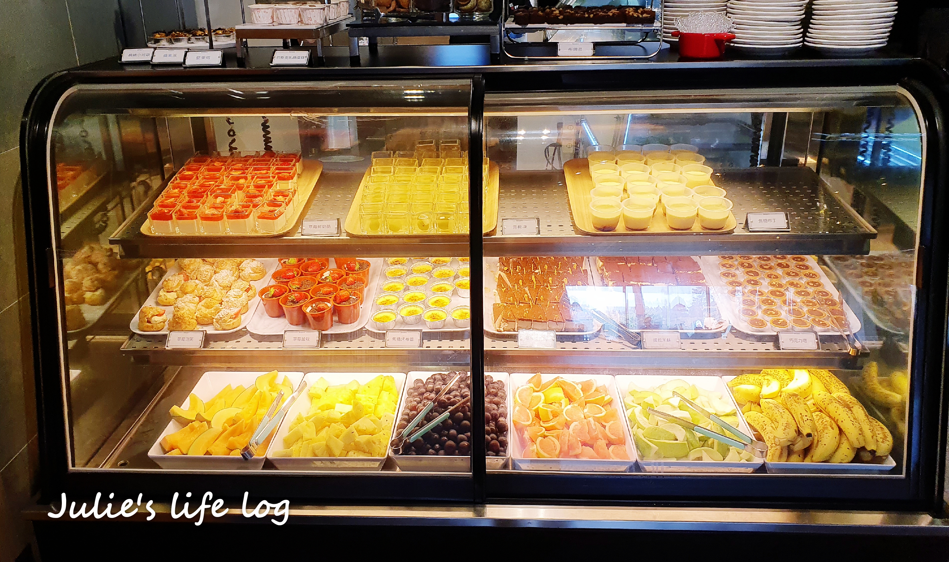 甜點有布丁、蛋糕、奶酪、泡芙。下面一排是水果。