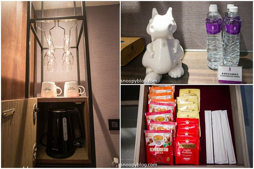 抽屜打開裡面有伯朗咖啡和TWININGS的茶包,迎賓點心是「第8口鳳梨酥」,