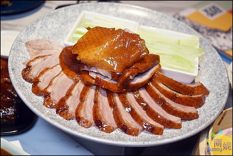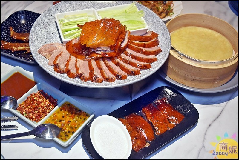 半隻烤鴨片出一大盤鴨肉,鴨皮香酥帶脆,咬的時候立即噴發鴨油香氣。半月型鴨皮帶肉則是軟嫩又多汁,可以搭配三種沾醬吃到多重風味。
