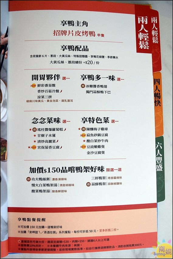 餐點選項很多元,烤鴨必點之外,還有很多款創意中菜,可單點也有2人/4人/6人套餐,打破傳統烤鴨限制,2個人也能輕鬆吃到豐盛美味。很推薦點多人套餐再加點單點,這樣吃下來很豐盛又超值。特別提醒:片皮烤鴨要事先預約才吃的到喔。