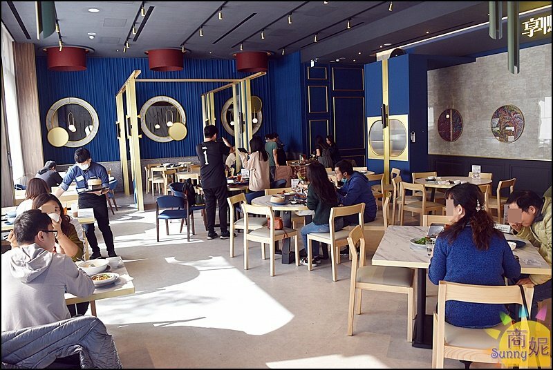 座位區分左右兩區,以4人方桌、圓桌為主。後方還有大桌可供多人用餐。藍色及圓形元素,看起來充滿時尚感,不像傳統中式餐廳。