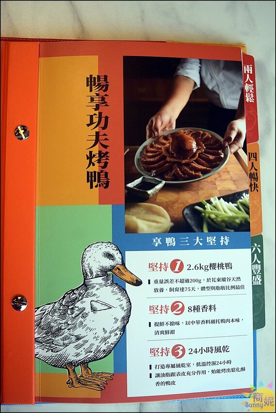 享鴨菜單中有介紹,烤鴨都是選用飼育達75天、在花東縱谷天然放養的櫻桃鴨,每隻重2.4~2.6公斤,用8種香料提鮮不搶味,在專屬風乾室低溫控濕經過24小時風乾,烤出鬆化酥香的烤鴨。