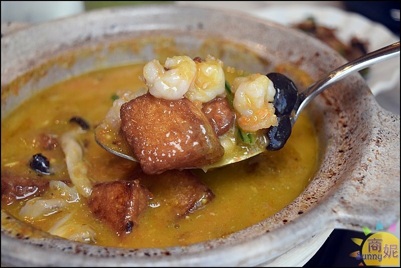 煲湯是紅蘿蔔加上鹹蛋黃金沙熬煮,味道蠻甜的。裡頭的料不少,滑嫩的炸芙蓉豆腐、還有鮮甜的蝦子、扁豆菇類,鹹鹹甜甜的滋味很下飯,這道是店內的招牌餐點,小朋友會很喜歡。