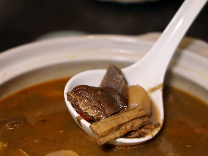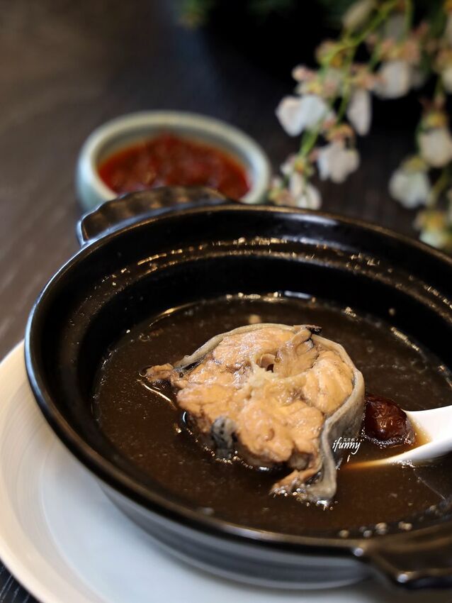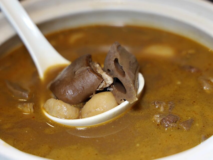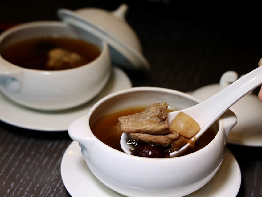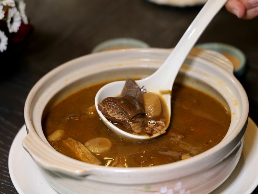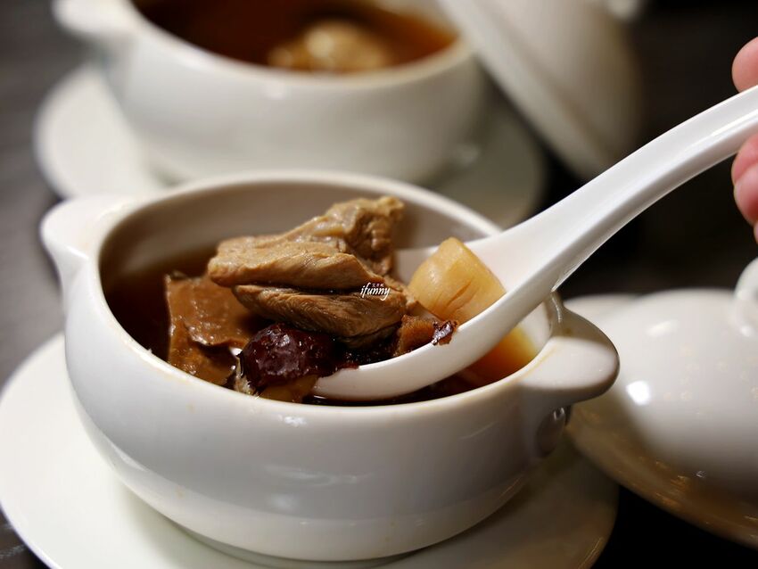 羊腩是羊腹部下側肉,為秋季及冬季常見的食品,廣東及港澳通常以柱侯醬及枝竹煮製成「羊腩煲」。加入黑棗、枸杞、人參鬚、黨蔘、熟地等補脾養胃、潤肺生津中藥材,並加入荸薺、蓮藕等,精心熬煮5小時。長時間下來最後呈現的湯頭,鮮甜濃醇,喝上一口立即暖心又暖胃。帶皮帶筋的羊腩軟嫩中帶Q勁,配料腐竹、荸薺、蓮藕等都帶來口感的變化,這道湯品,深獲我們一致的好評。