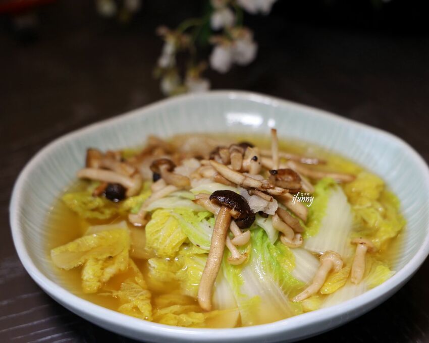 娃娃菜搭配野菇,以上湯煨煮出清爽可口的好滋味。