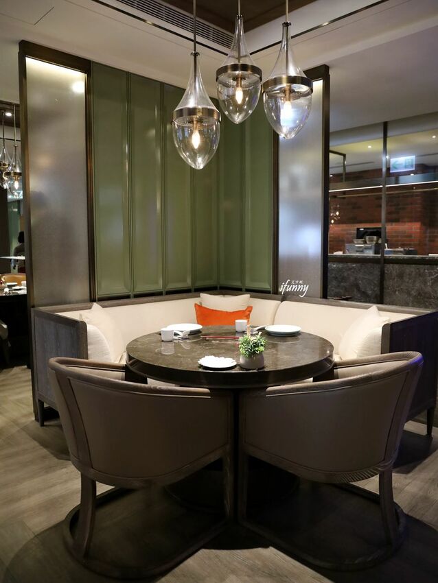 座位間的走道很寬敞,小沙發與靠牆貴妃椅的設置,與莫蘭迪綠為主色系的搭配,呈現古典細緻的美。
