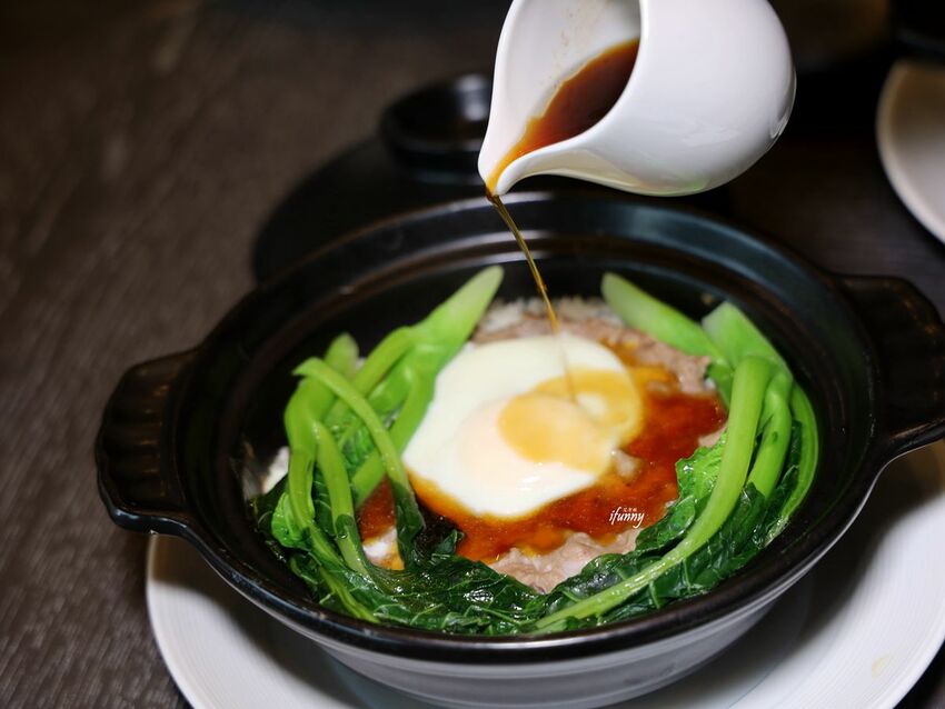 淋上特製醬汁後,趁著熱氣攪拌,隨之冒出熱騰騰的白煙,光看著就幸福感油然而生。而油脂及香氣並具的臘味實在太迷人了!臘味煲仔飯不只著重臘味,米飯也相形重要,特別選用泰國米,吸飽了臘味鹹香的米粒,口感香Q且濃郁飯香令人無法抗拒。