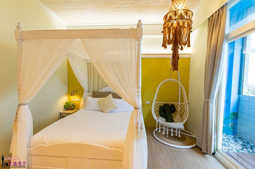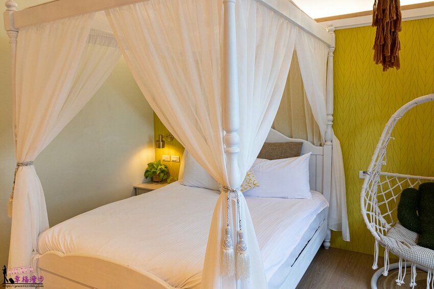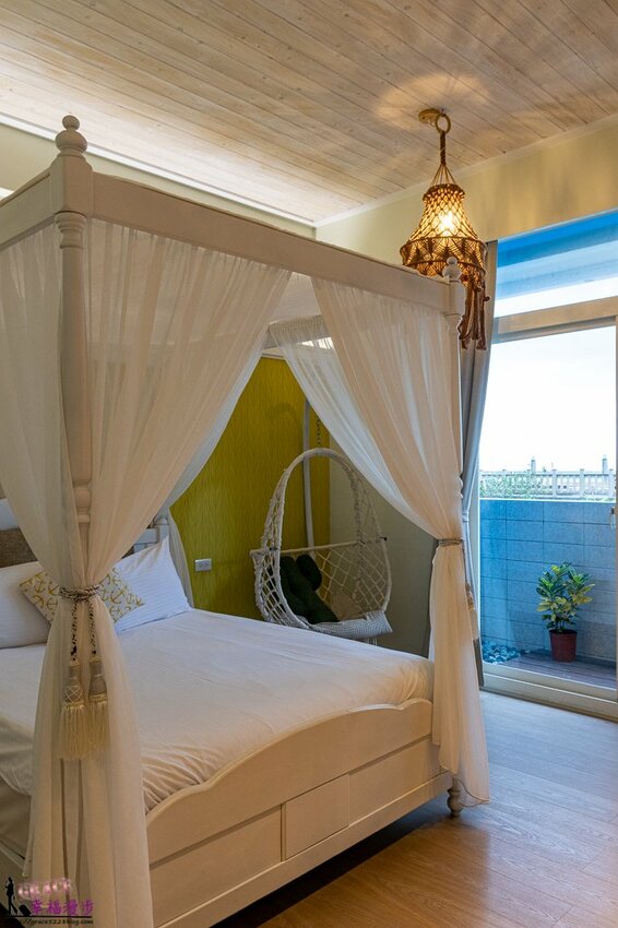 整個房間也太浪漫了,床的四周有著紗幔,編織的燈罩和吊椅呈現出夢幻公主風格,而且床的兩側都有插座,現在人很重視手機使用,睡前難免都會划一下手機,所以床的旁邊有插座是大大的加分。