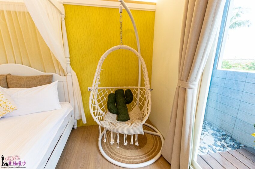 編織吊椅帶出慵懶休閒渡假風,旅行不用太急躁,就讓自己窩在這椅子上靜靜地聽著海聲也是很愜意。