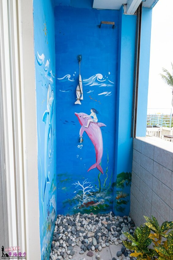 陽台也別有巧思,牆壁有著海洋童話彩繪,地上鋪上點小石頭點綴,有著景觀植物增添綠意。