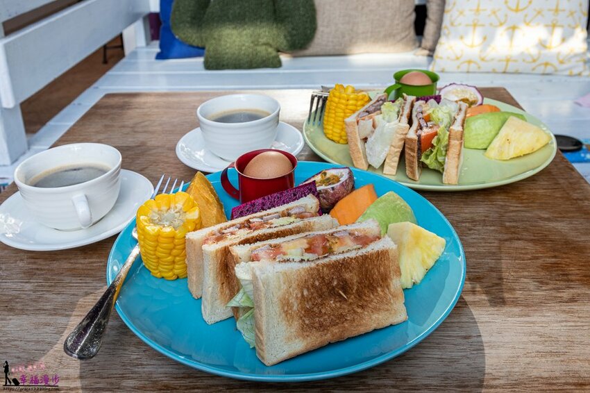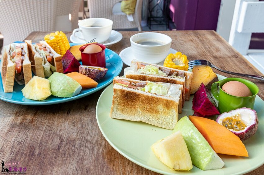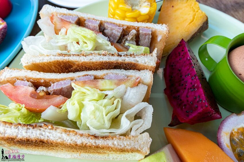 民宿闆娘已經幫我們準備好早餐,天啊!這早餐也太豐盛了,有五種水果、蒸地瓜、水煮玉米、水煮蛋、三明治。