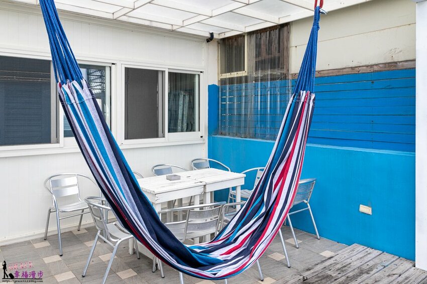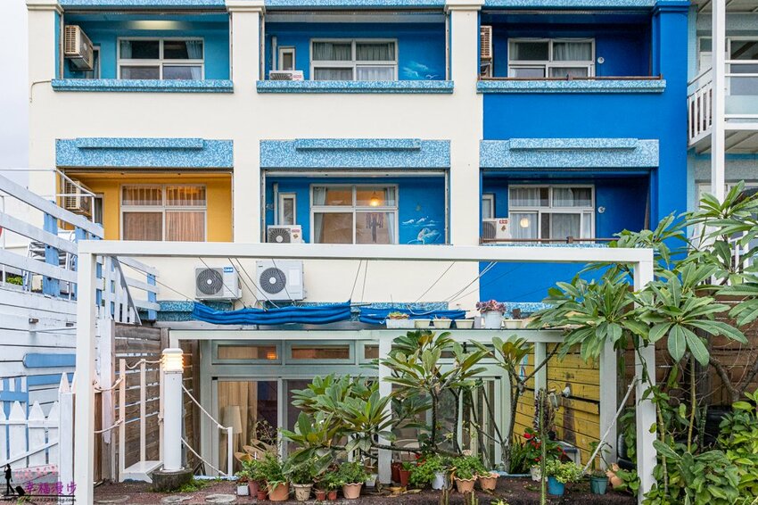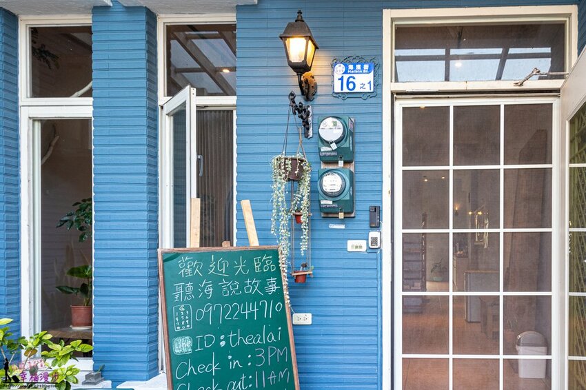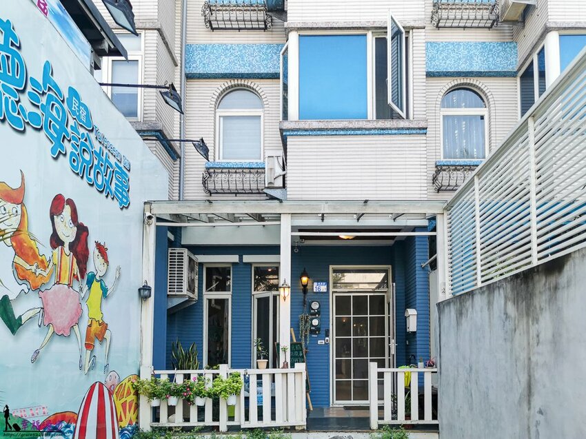 聽海說故事民宿整個大門裝潢是以藍色和白色為設計,整體有種美式鄉村休閒住宅風格。
