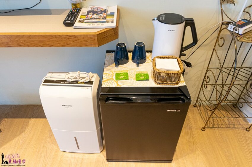 房間內有著電視、冰箱、熱水壺、茶杯和茶包,長方形的檯桌方便旅人放置東西。