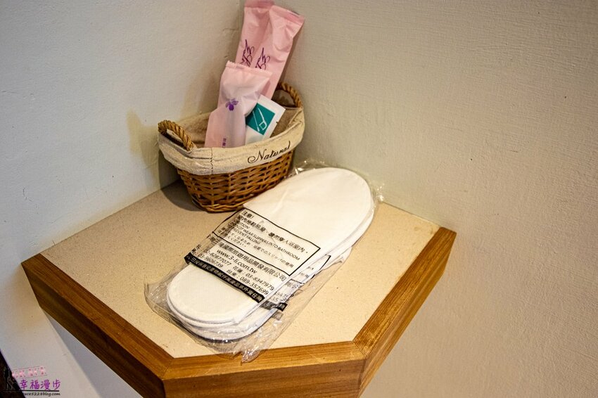 室內拖鞋和牙刷備品擺放在門旁的角落處。