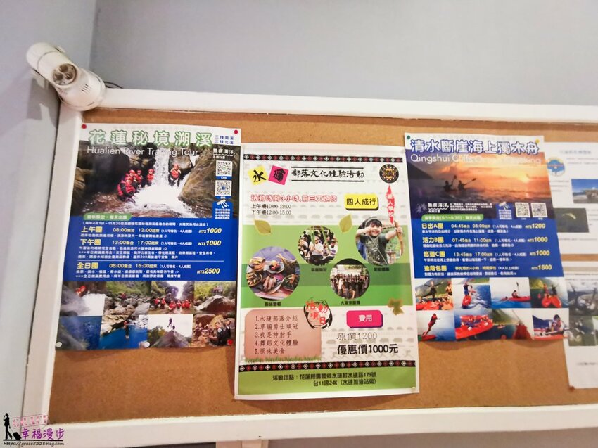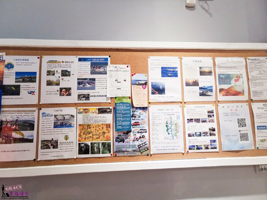 牆壁上佈告欄有著花蓮的旅遊資訊,來到花蓮可以好好的深度旅遊,若不知道從玩起可以在這裡找資料,或是想體驗賞鯨、溯溪、獨木舟、泛舟、獵人體驗或是包車一日遊也可以請民宿代訂。