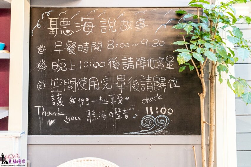 門口有個小黑板上面寫著民宿的聯絡方式,還有辦理入住和退房的時間。