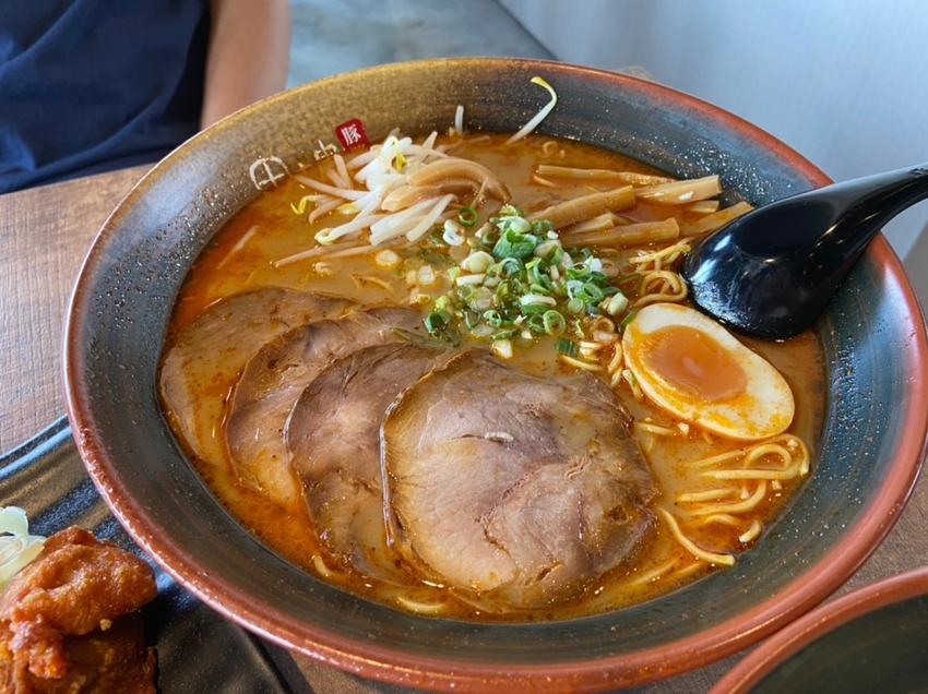 老公點的地獄豚骨拉麵,我老公說不辣,不過對於吃微辣的我,喝一口湯,覺得湯頭的辣太衝,一入口就能感受到滿明顯的辣感在上顎,口味較為濃郁,全拉麵也只有這個是辣的口味,老公吃完也會飽。
