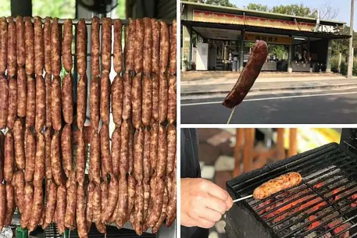 ▲聞著現烤的米腸香腸的香氣整個口水都快不聽使喚了,店家會幫忙切小塊方便食用。