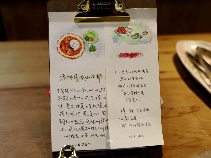 營業時間內會供應兩種鹹食,這在官方粉專訂位時才會被告知餐點的內容及價位。基本上香料優格咖哩雞是固定會有的,而另一種則是隨機。這天的是紅酒燉牛肉。訂位時順便訂餐,這樣就可以確保當天可以被保留餐點。