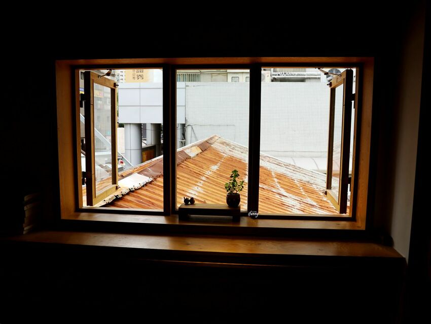 廚房對面的窗邊高腳椅區,看出去的窗景是鐵皮屋生繡的屋頂,刻畫的是台北城市角落的景象,還有抬頭就能見到的藍天白雲,這樣的愜意在此隨手可得。