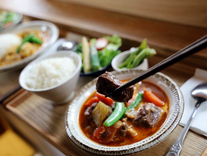 看到煮到通透的洋蔥及軟熟的胡蘿蔔,還有那濃香馥郁的湯汁,就覺得這道牛肉是花了心思及時間來熬煮的。將湯汁淋在粒粒分明的白飯之上,吃得到來自紅酒的酸香及蔬菜的香甜,令人不禁扒光了白飯。