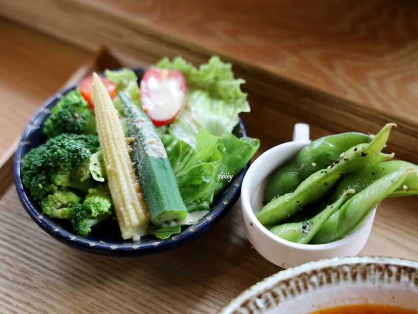 隨餐附上的蔬菜沙拉,淋上了胡麻醬,相當地清爽開胃。自製的涼拌毛豆,黑胡椒的微辣刺激,也令人一口接一口地完食。