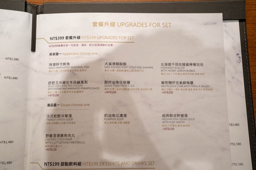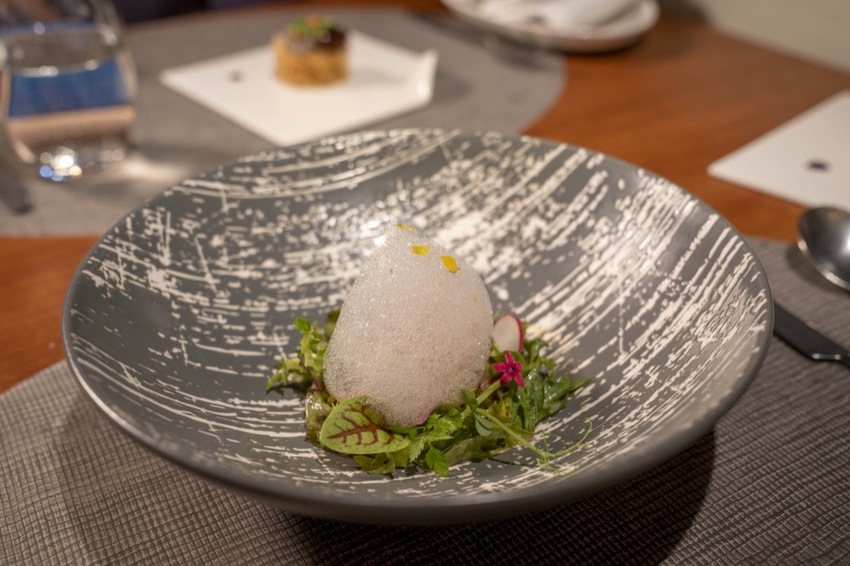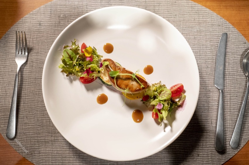 滑嫩又綿密的鴨肝,外皮煎得恰恰好,香氣細微入口卻非常濃郁,搭配筊白筍、櫛瓜,以及最底下畫盤是山藥跟蘋果泥,整體吃起來非常清爽又開胃!