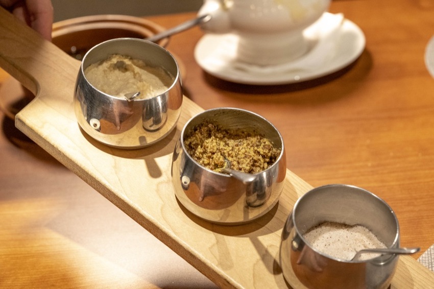 點牛排就會附上的三種醬料,分別是「玫瑰鹽」、「芥末子」、「辣根醬」,玫瑰鹽可以說是牛排好朋友,切一小塊牛排沾點鹽就能提出牛肉天然的鮮甜滋味,另外芥末子跟辣根醬口味辛辣不嗆口,沾一點點就能帶出更多層次的風味!