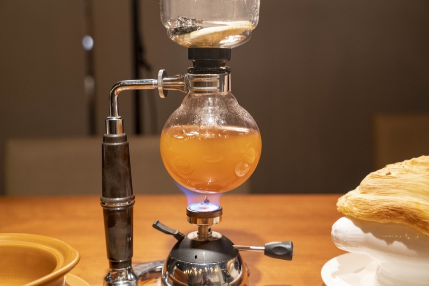 這道澄清雞湯居然使用「虹吸式咖啡壺」呈現,底下放個小瓦斯爐加熱煮熱湯,大約3-4分鐘即可,接著把特製墨魚丸再倒入雞湯。清澈的湯頭口味卻非常濃郁,配上墨魚丸增添嚼勁口感超對味!