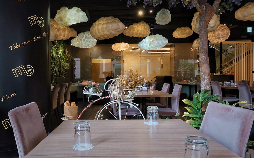 義沐Eat Mu Cafe,內部採挑高設計搭配著一旁大面的落地窗,讓用餐氛圍感到明亮舒適,在桌與桌的安排設計上都保有些距離,用餐時不會感到太過擁擠,而靠近落地窗的座位可是熱門區,不少人都指定要坐在靠窗座位,很慶幸這天的用餐我們就坐在靠窗位子。