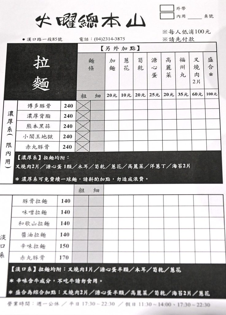 ▼火曜總本山拉麵菜單