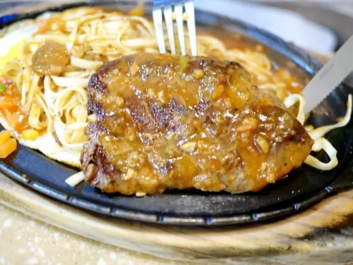 滾燙的鐵板上飄散出牛排焦香氣味,鐵板上有沙朗牛排、鐵板麵及蛋等,這鐵板麵Q勁十足很好吃,這沙朗牛排是屬於品質較好的部位,這塊沙朗牛排煎至7分熟,肉質很紮實又細緻真好吃
