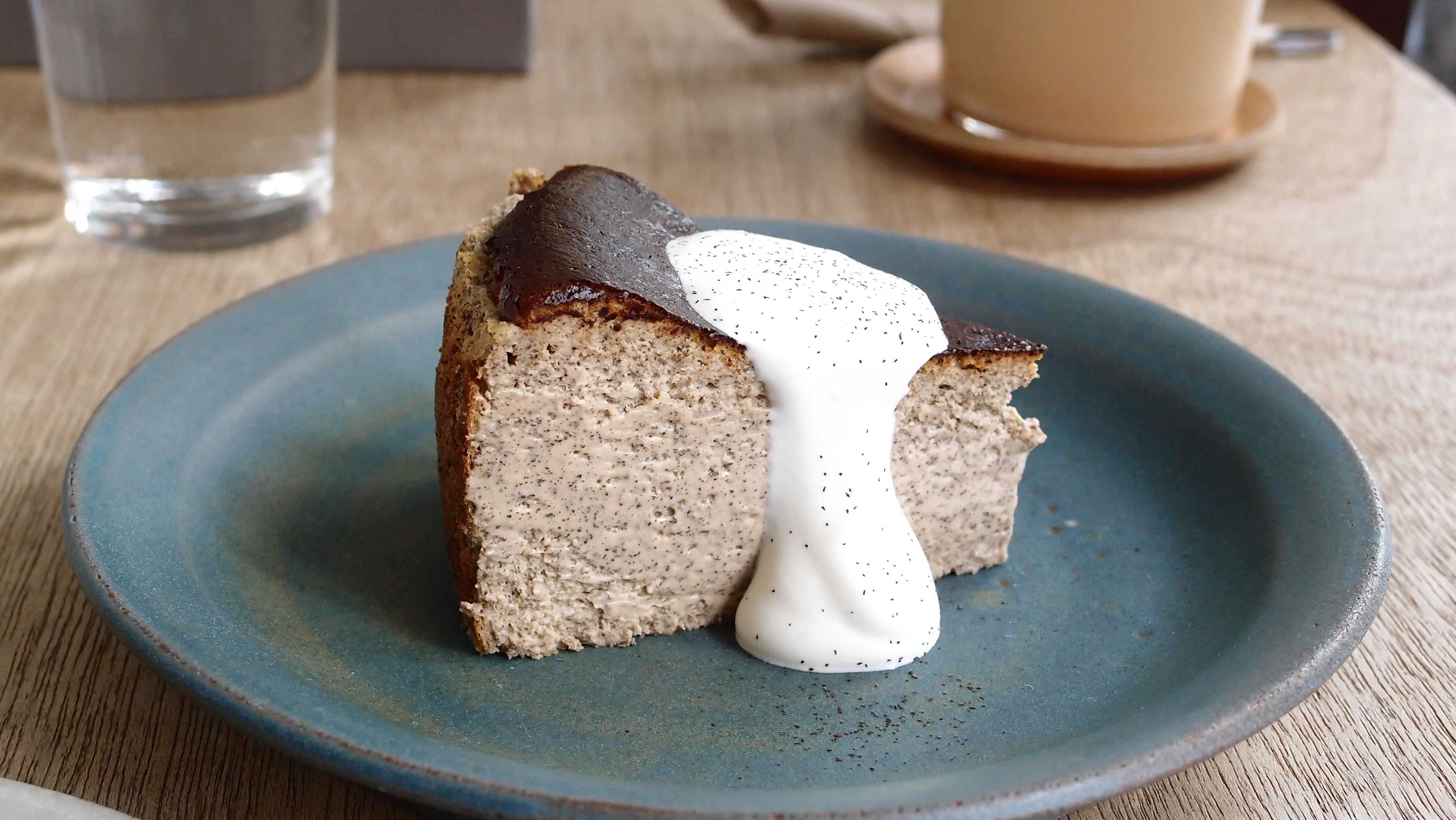 上雪白是凝滑的生乳酪,下灰白是摻雜烏龍茶葉的稍熟乳酪。