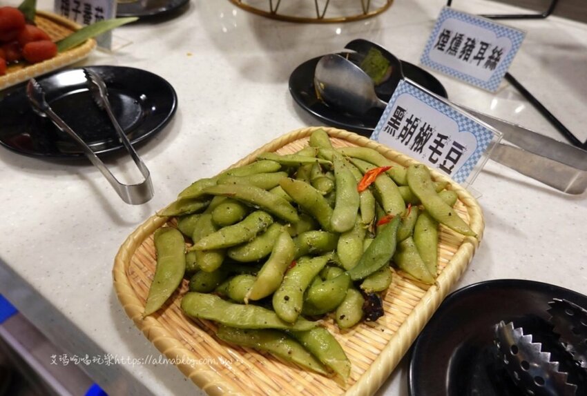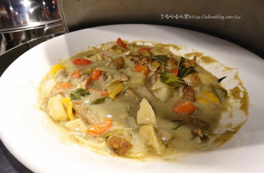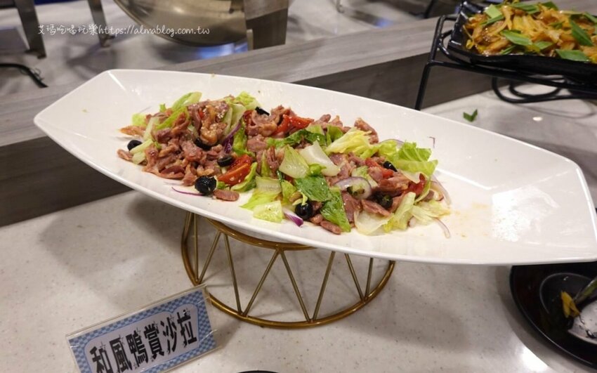 吃到飽戰力超弱的我們!只能每一種都一點點嚐鮮,和風鴨賞沙拉、煙燻豬耳絲、梅子番茄、絲瓜蛤蠣、泰式綠咖喱雞、紅醬海鮮義大利麵和川蜀酒釀豆瓣魚。
