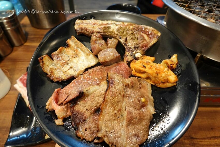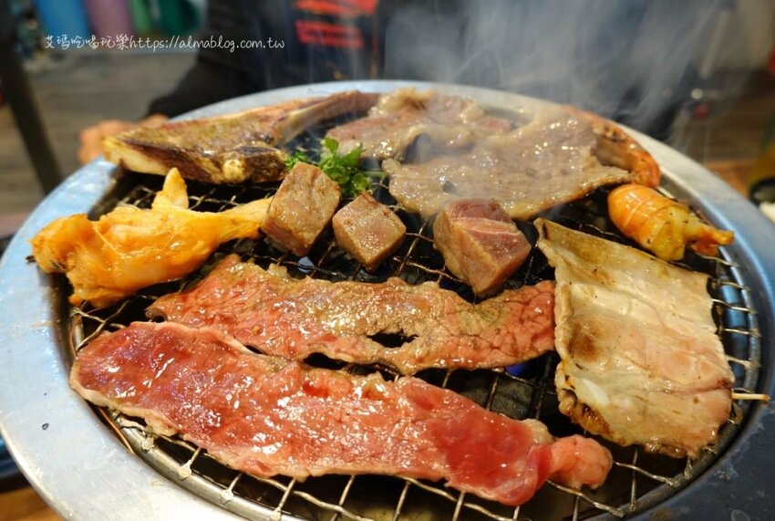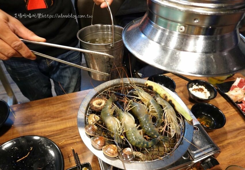 冰鎮泰國蝦的同時,先來烤一半基本肉盤,這烤爐本身不大,烤網設計有點圓弧狀,中間比較高一點,烤爐裡面只有中間有火,旁邊一圈是水,所以火溫不太好控制,中間的火一直很猛,旁邊一圈就很弱只是微微溫。