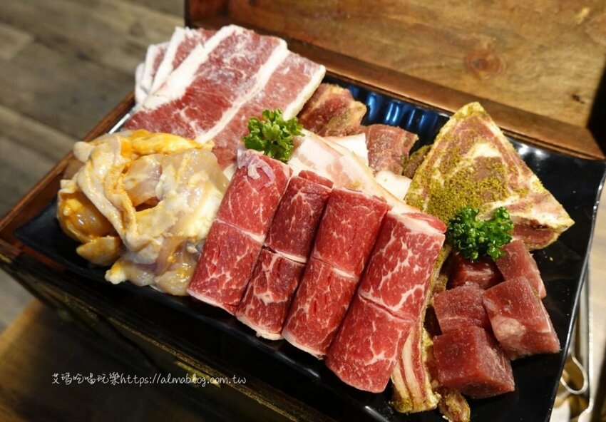 海鮮寶盒有:紐西蘭CH骰子沙朗牛、美國牛五花、台灣豬五花、酒釀味噌雞、韓式辣味雞、孜然羊小排和香料豬小排。