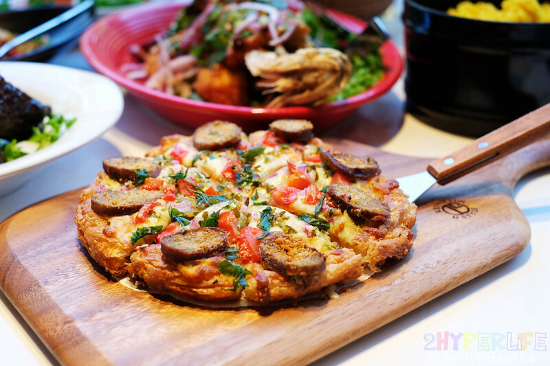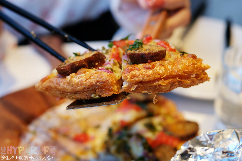 上頭有主廚特製泰北香腸以及切片的小番茄、九層塔、洋蔥起司和明顯的香料氣味,吃起來非常香,這道算是偏重口味會忍不住一接一片呦!