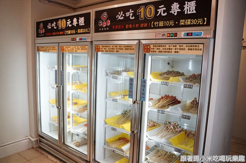 在店內最裡面放置串串的位置,有兩大櫃都是10元的專櫃,裡面有來自老闆處理的蔬菜捲肉,也有麻辣醃肉及原味肉。