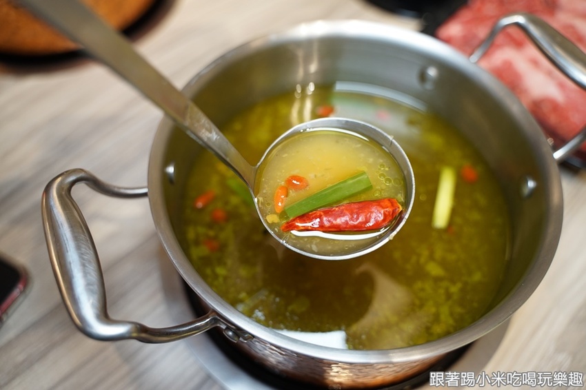 不吃辣的朋友,也有不同的鍋底,小米也很推薦的新口味鍋底,三鮮金湯(69元)帶點檸檬清香卻鮮味濃郁的湯頭,蠻清爽涮海鮮或是肉都挺不錯的喔