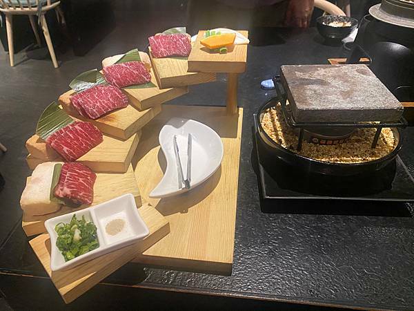 ↑美國霜降牛採用浮誇的階梯盤裝,可燒烤後搭配蔥鹽一起吃