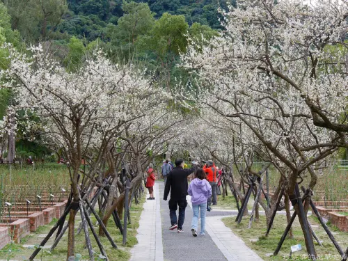 梅花剛好在玫瑰園呈現3排梅花樹林,可惜的是這裡沒有志成公園密集,比較稀疏,可能還需要一點時間成長,另外也可以看見梅子結果!