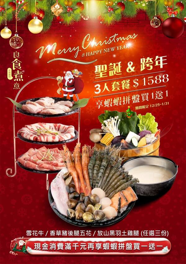 跨年夜還在想要去哪裡嗨森!推薦大家可以來一趟『良食煮意有機火鍋』享用美味的跨年三人分享餐1588元,內容物有三份鍋底、三份菜盤、三份肉盤(牛/豬/雞任選三份)及一份大海鮮拼盤,一次滿足想吃海鮮和肉肉的慾望,三人同行超划算,不僅如此還可參加現金消費滿千元即可享298元鮮蝦拼盤買一送一活動,CP值高到爆表!
