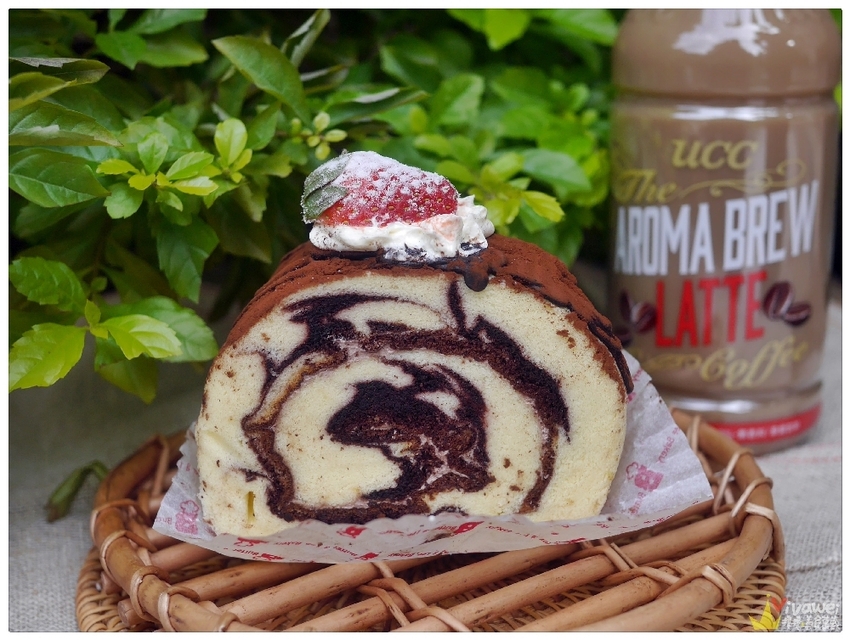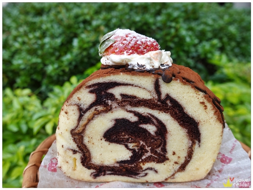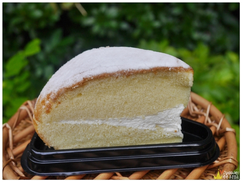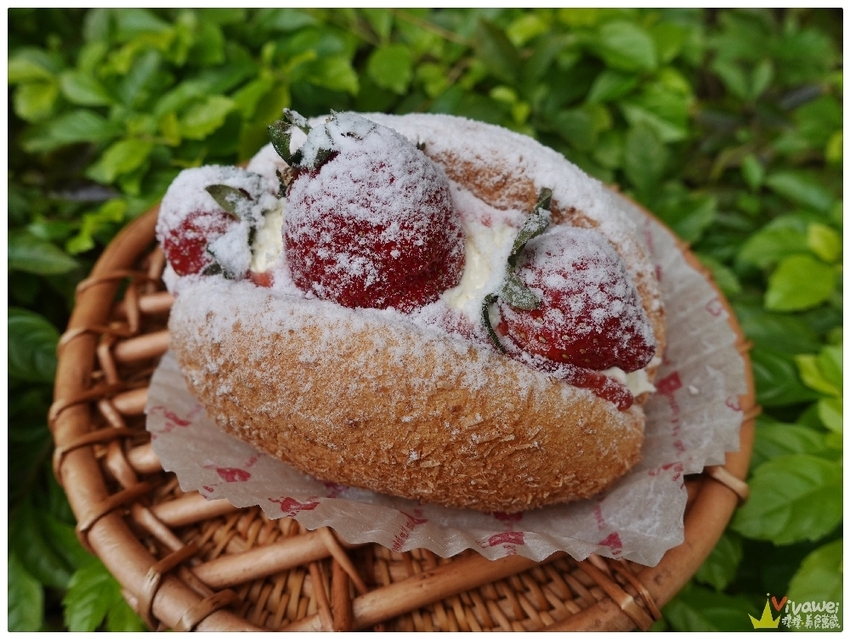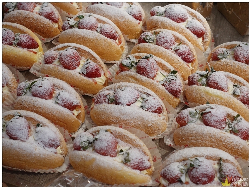 ▲這款季節限定的草莓元寶蛋糕也是奶蛋素可食的~蛋糕體是戚風蛋糕~中間夾了奶油、草莓醬和新鮮草莓,外層再加了些糖粉!