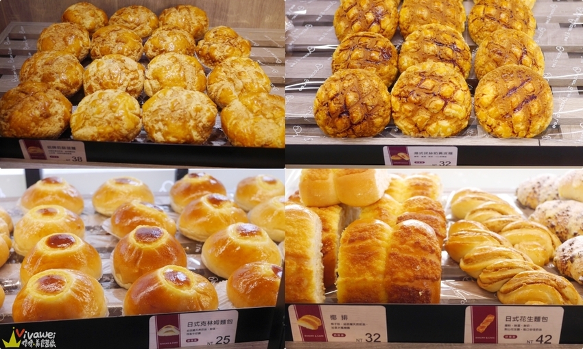 ▲招牌奶酥菠蘿、港式拔絲奶黃菠蘿、日式克林姆麵包、椰排、日式花生麵包。