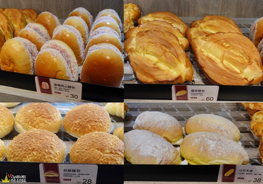 ▲草莓夾心麵包、羅宋麵包、奶酥麵包、Q芯天使。