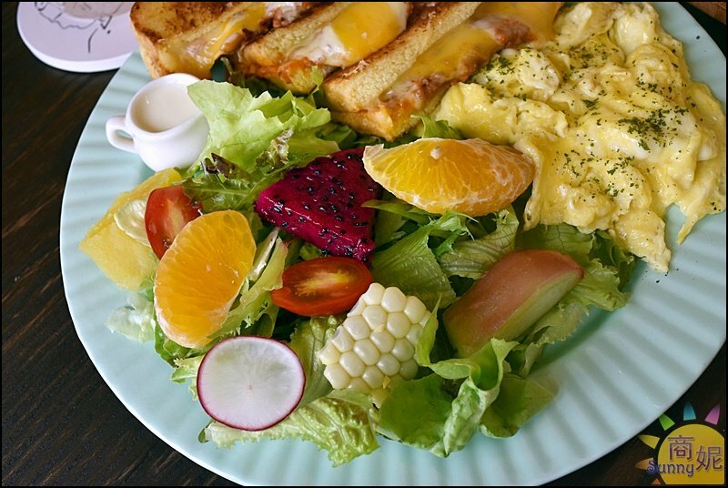綜合森林沙拉份量十足,有各種新鮮水果,蓮霧、柳橙、水果玉米、火龍果、鳳梨、小番茄…比一般早午餐店的沙拉還要豐盛。
