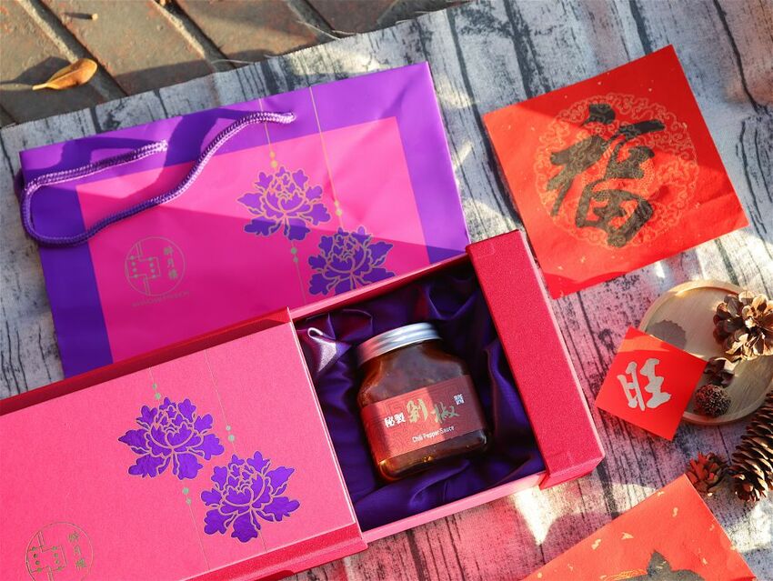 醉月樓 醉月雙醬禮盒 ,使用 紅色錦盒盛裝,上方的紫色牡丹印花 搭配金色圖文,更顯隆重奢華質感,因為裡面(含 XO醬+秘製剁椒醬)各一,拿起來格外有份量呢!!!