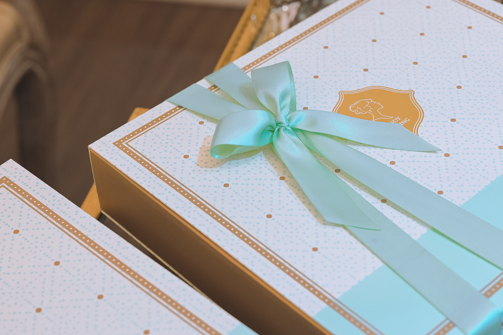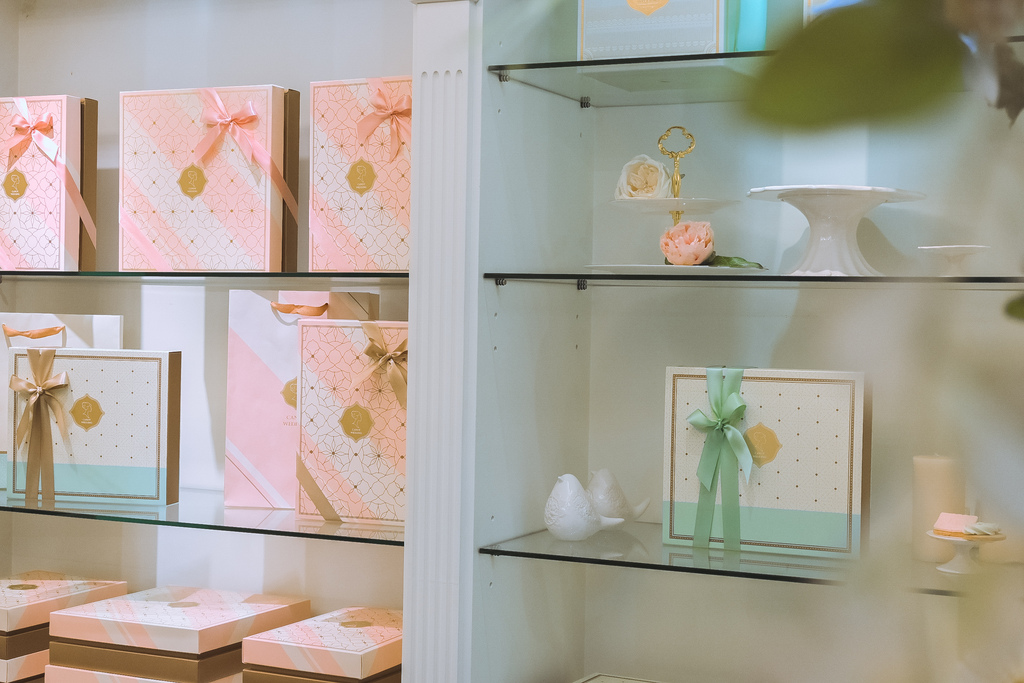 喜餅禮盒有兩色可以選擇,像是充滿夢幻感的粉紅色或是典雅的湖水藍色可選擇,依照預算和需求,選擇想要的盒裝,禮盒的有分中、大、特大(特大僅限湖水綠)這幾款可以選擇,都會附上可愛的緞帶。