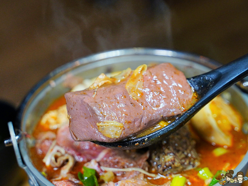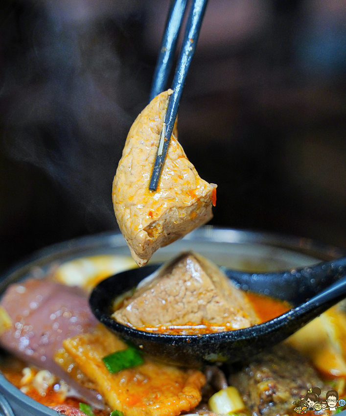使用台灣板腱牛,兩顆糖心蛋、麻辣鴨血、麻辣臭豆腐、手工丸子、手工米血等食材
